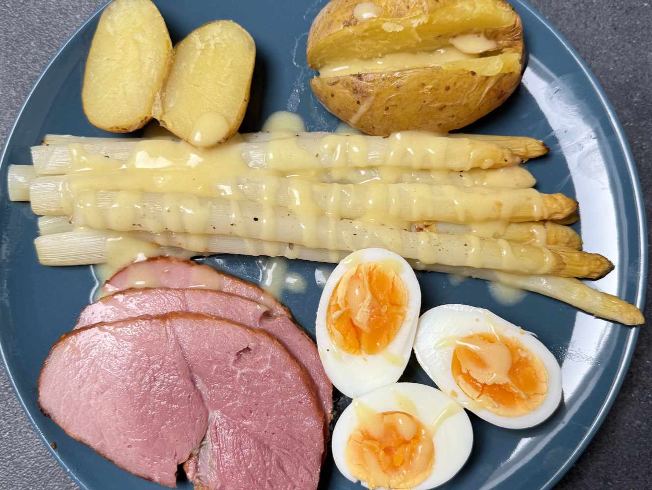 Asperges met beenham en eigen gemaakte honing/mosterdsaus