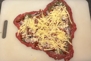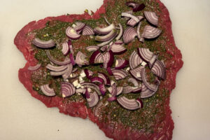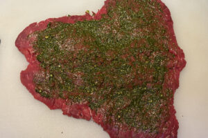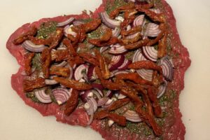 Bavette carpaccio rollade, door de bavette te vlinderen ontstaat er een dunne lap vlees dat uitermate geschikt is om een gevulde rollade te maken.