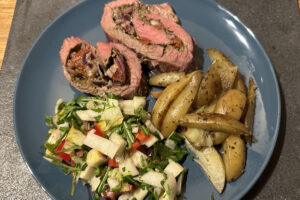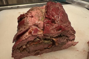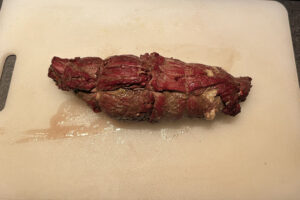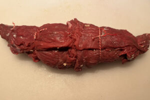 Let na het vullen goed op hoe je de bavette oprolt we willen (zoals gezegd) tegendraads in snijden (dus als de draden van onder naar boven lopen, rol je de bavette van links naar rechts op)