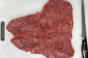 Leg de bavette op de snijplank met de draden van links naar rechts.
