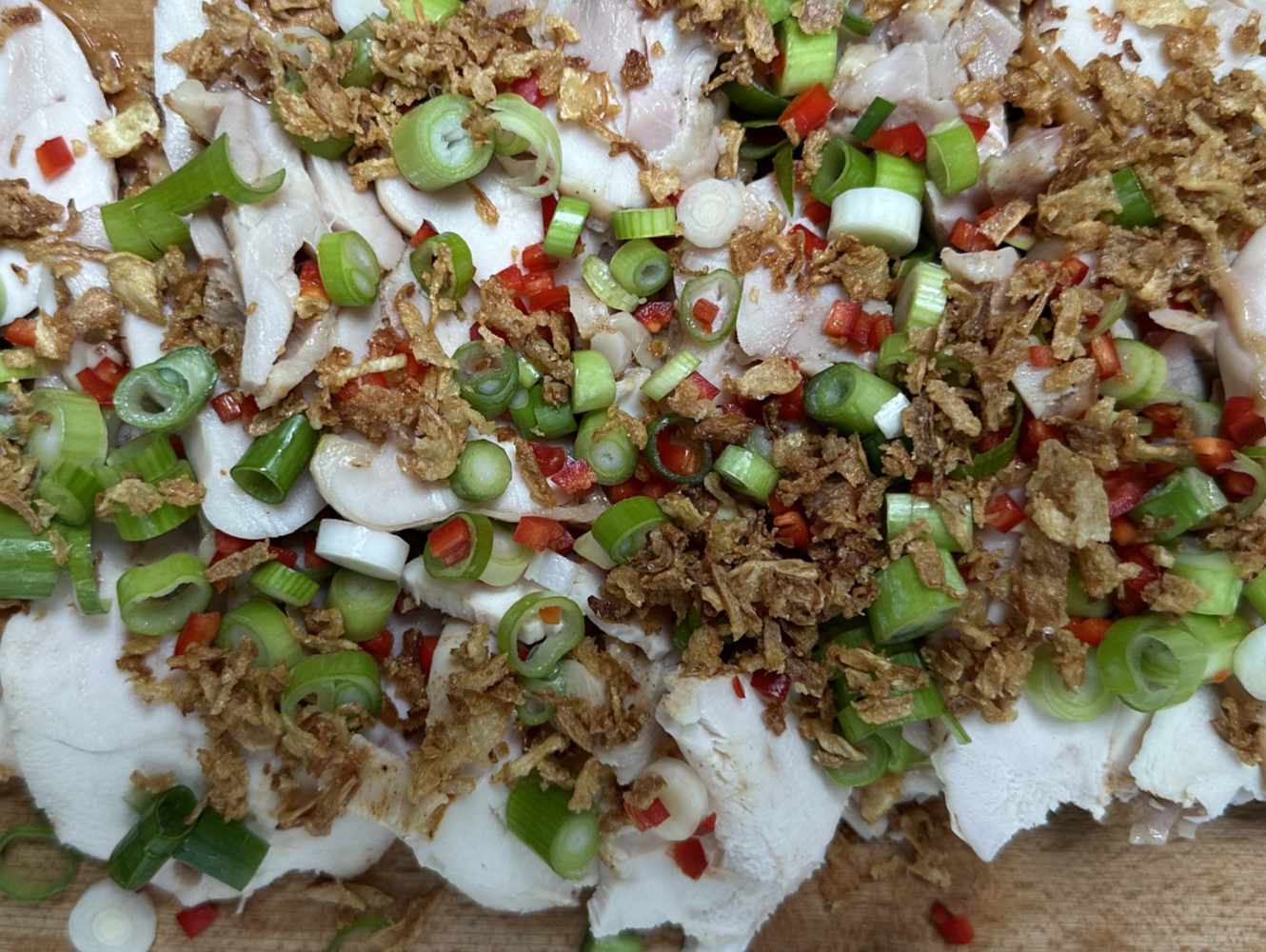 - garneer met de lente uitjes, de rode peper, de sesamzaadjes en de gefrituurde uitjes