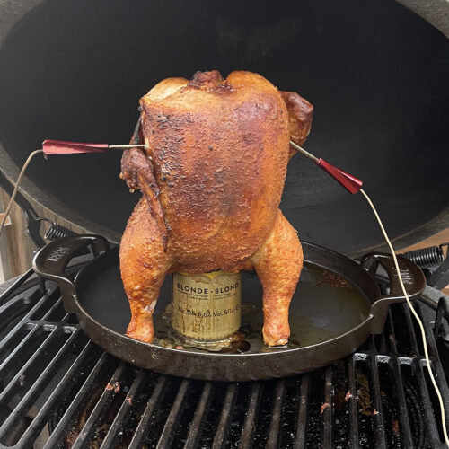Zet het bierblik op de gril en schuif de kip er met zijn kont overheen.