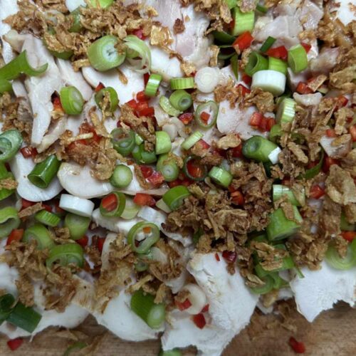 garneer met de lente uitjes, de rode peper, de sesamzaadjes en de gefrituurde uitjes