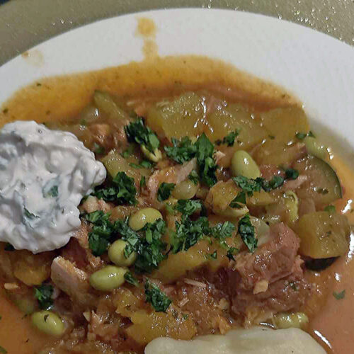 voeg de pompoen blokjes, courgette en de bouillon toe en laat minimaal een uur sudderen.