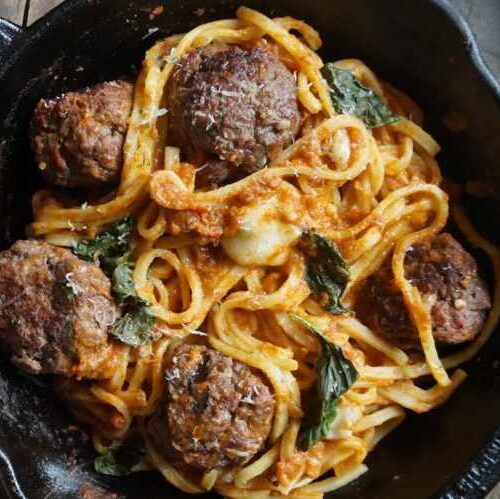 Een pasta met een diepe pittige saus en pittige, kruidige en rokerige gehaktballetjes. Wij hebben de verse pasta eerst even gekookt zoals we ook met gedroogde pasta zouden doen.