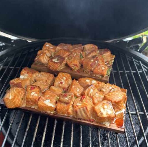 • Dep de grillplank droog en leg de zalmblokjes erop